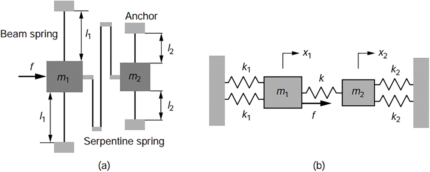 Fig. 8a illustrates the mechanical filter microsystem being driven by the force . We consider the parallel beam springs acting on each of the shuttle masses ( and ) as well as the serpentine spring supplying elastic coupling between and in order to develop the lumped-parameter physical model similar to the MEMS device.