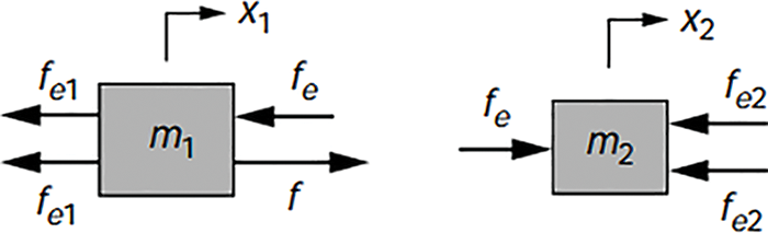 The resulting lumped-parameter model, which has two degrees of freedom thanks to the displacements and , is seen in Fig. 8b. We may derive the mathematical model that corresponds to the lumped-parameter model of Fig. 8b by using the free-body diagrams of Fig. 9 and Newton’s second rule of motion. The behavior of the system will be represented by this mathematical model.