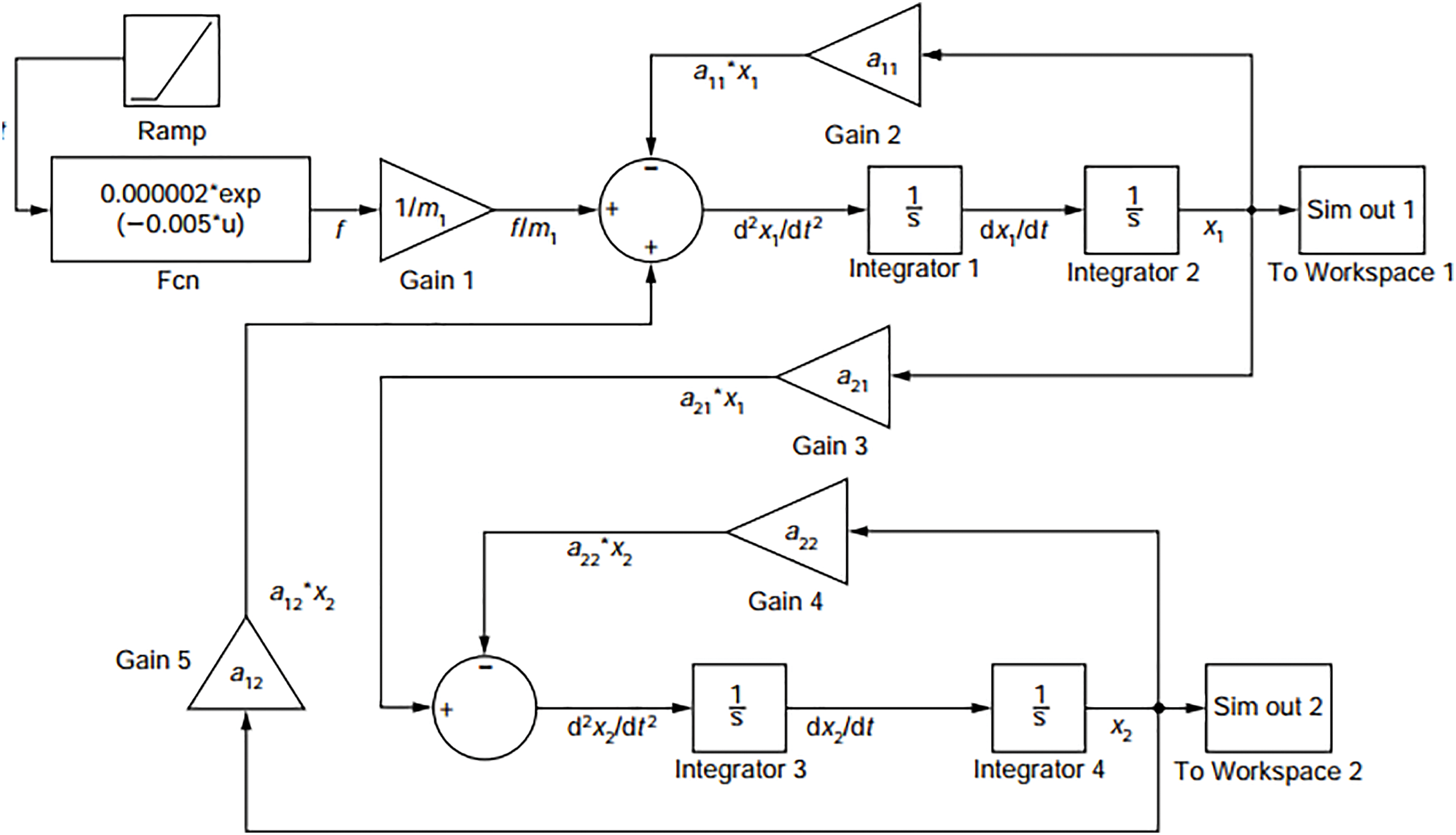 The combination of the ramp block from the source library and the math function from the math operations library determines the force applied to mass . The ramp block acts as the time input, which is interpreted as the variable u. For the math function, the specific expression , needs to be specified, representing in this example. In Fig. 10, the interconnection between and illustrates the stiffness coupling, denoted by k. After exporting the data to MATLAB®, Fig. 11 displays the plots showing the behavior of and over time [16]–[18].