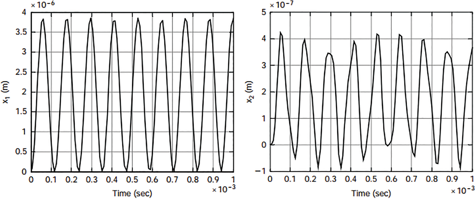 Fig. 11. Time variation of the shuttle mass displacements for the mechanical system (in meters).