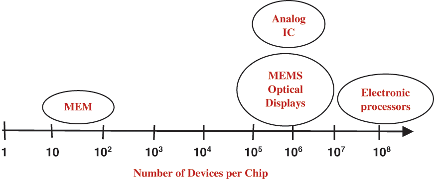 Fundamental devices | Limited set: transistor, capacitor, resistor | Widely varied: fluid, mechanical, optical, electrical elements (sensors, actuators, switches, mirrors, etc.) |