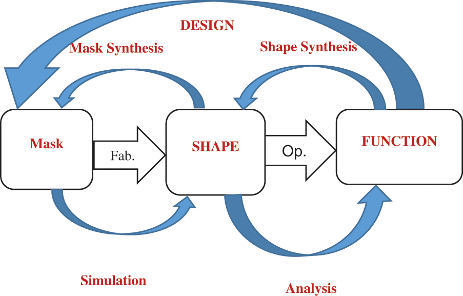 The boxes in Fig. 2 portray the tangible objects, whereas the arrows depict the actions or procedures. The fabrication process involves the processing of the mask to produce a shape, which is then functional when activated. The lower arrows portray simulation and analysis. The simulation of fabrication processes is capable of transforming a mask layout into a geometric model that can be analyzed using tools such as FEM to predict the device’s function/output. Fig. 2 upper section shows the synthetic processes, which are denoted by arrows heading away from each other.