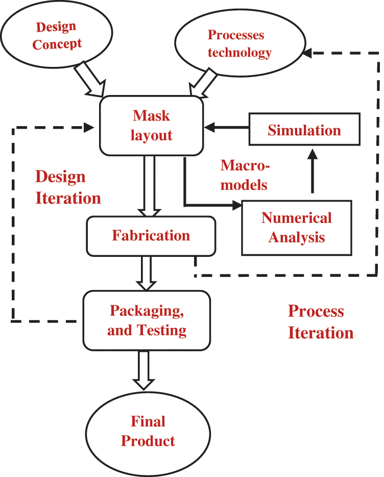 The shape can be synthesized to display a desired function, while the mask can be synthesized to exhibit a desired shape. Fig. 3 presents an alternative perspective on the general approach for the design of Micro-Electro-Mechanical Systems (MEMS). Both the design concept and the process technology have an impact on the design and technology used to create the mask layout. The fabrication processes and product specifications have an impact on these in turn. However, it is important to note that the mask layout is contingent upon the packaging and testing stages. Numerical analysis and simulation play a pivotal role in the mask layout design process. Ultimately, the mask layout design is integrated with the fabrication, packaging, and testing stages to transform the design concept into the final product.