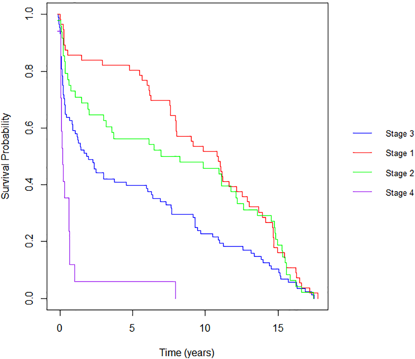 Patients in WHO Stage 3 experience a more rapid decline in survival probability compared to Stages 1 and 2. The survival probability drops sharply, indicating higher mortality rates. Patients in WHO Stage 4 have the worst survival outcomes. The curve drops very steeply, particularly in the early years, indicating a high mortality rate among patients at this stage. The survival curves for Stage 1 and Stage 2 are relatively close to each other, indicating that the difference in survival between these two stages is not as pronounced as between Stages 2 and 3 or Stages 3 and 4.