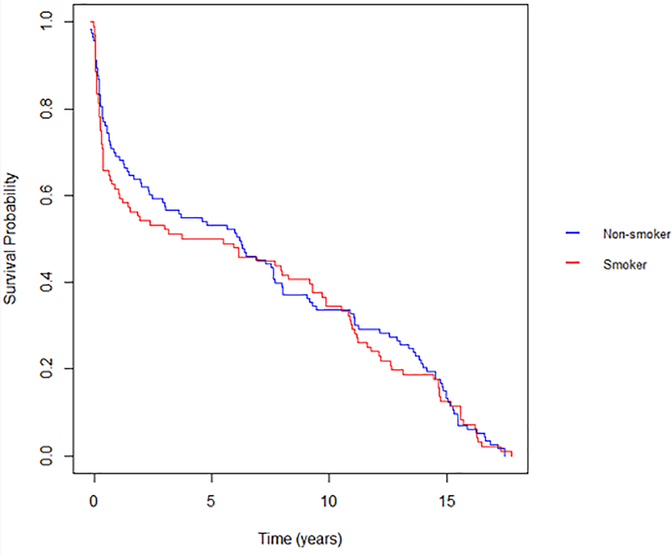 The analysis of smoking status also did not show significant differences in survival between smokers and non-smokers with a Log-Rank test (p = 0.70). This could indicate that smoking status does not necessarily affect survival with this sample. Similar observations were made in other studies by Salih et al. [9] where it was said that perhaps other factors had a greater impact on survival than smoking.
