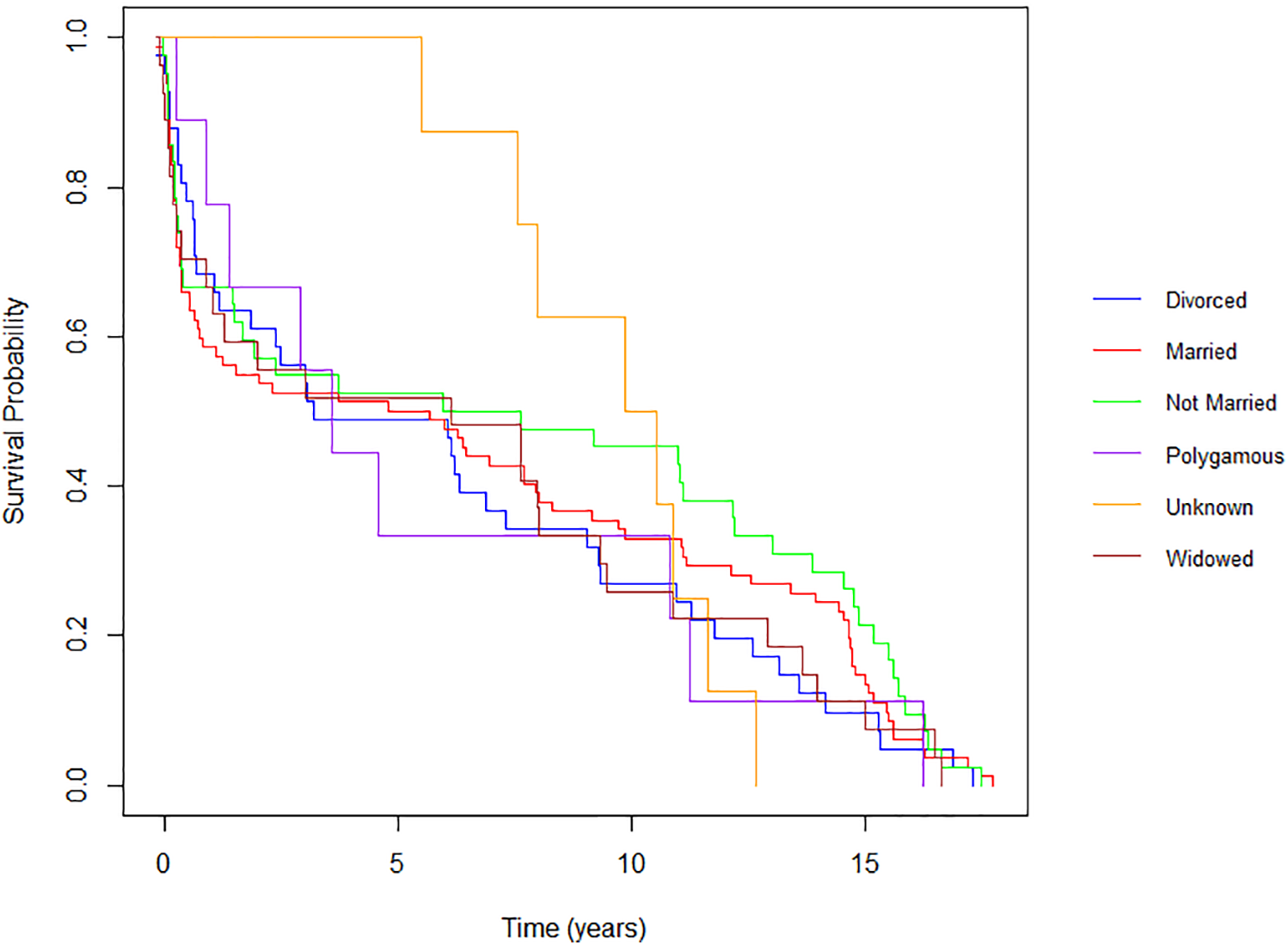 Lastly, a comparison of married and not married people further showed that marital status has no effect on survival since both sets of people have similar survival rates (p = 0.40). This finding is complemented by findings made by Nigussie et al. [6] in a similar study that did not establish marital status as a major predictor of survival and highlighted other socioeconomic or health-related variables.