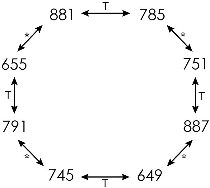 In Fig. 1 the numbers of the octet are placed at the vertices of a regular octagon. The illustration shows the process of transition from one number to another within the symmetrical octet.