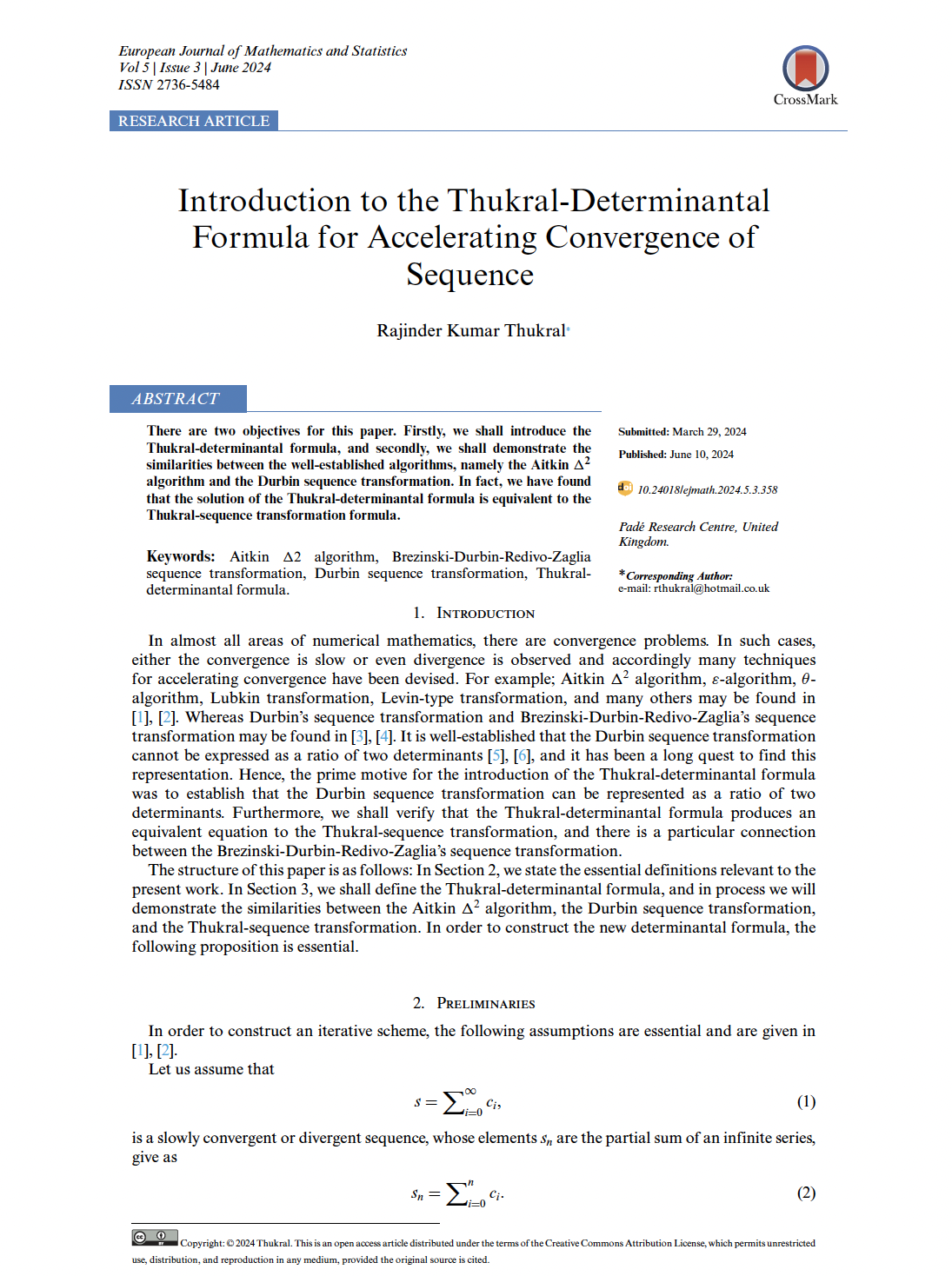 Introduction to the Thukral-Determinantal Formula for Accelerating Convergence of Sequence